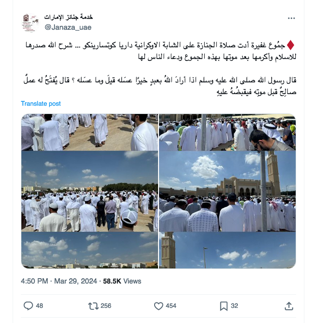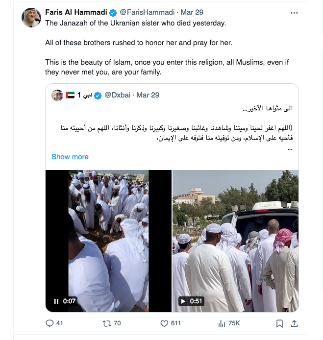 İslami İçerik yaratıcısı Faris Al Hammadi, X hakkında şunları yazdı: “Dün ölen Ukraynalı kız kardeşin Cenazesi”