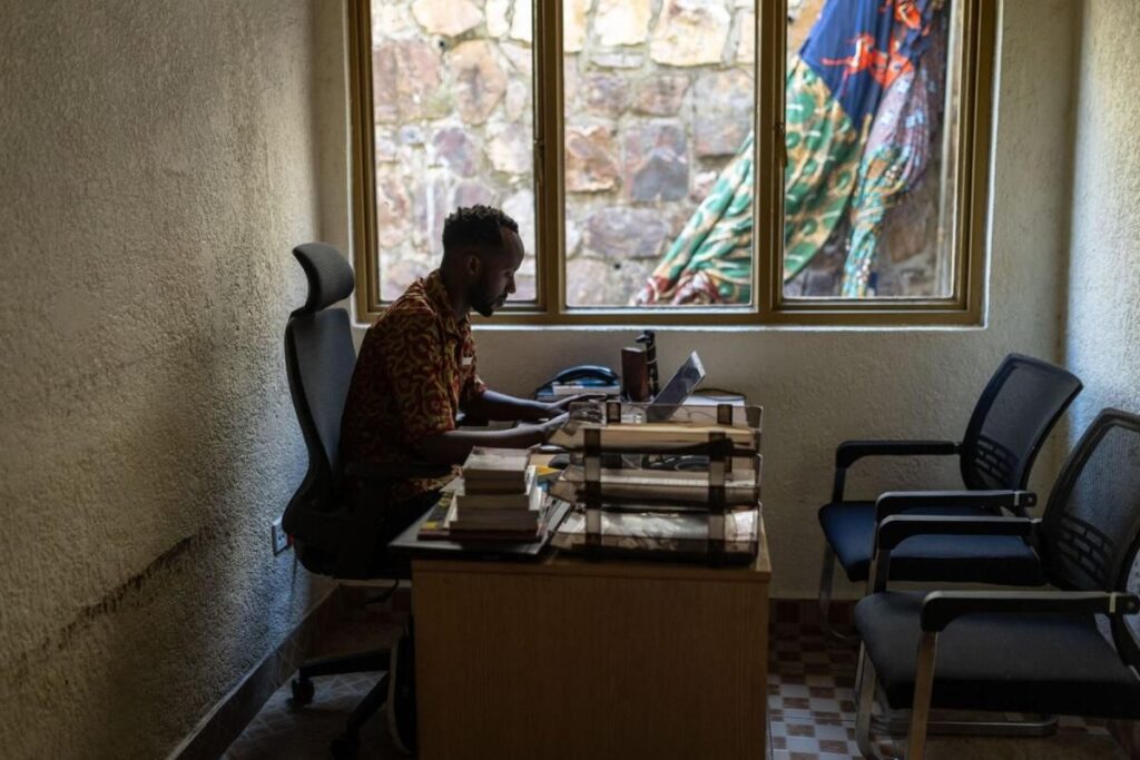 Manzi Rugirangoga, 26 Mayıs 2024’te Kigali’deki Fransız kültür Merkezi’nde dizüstü bilgisayarında çalışıyor. Rugirangoga, 1994 yılında henüz 1 yaşındayken annesini ve onlarca aile üyesini kaybettiği Tutsilere yönelik soykırımdan sağ kurtuldu. – AFP