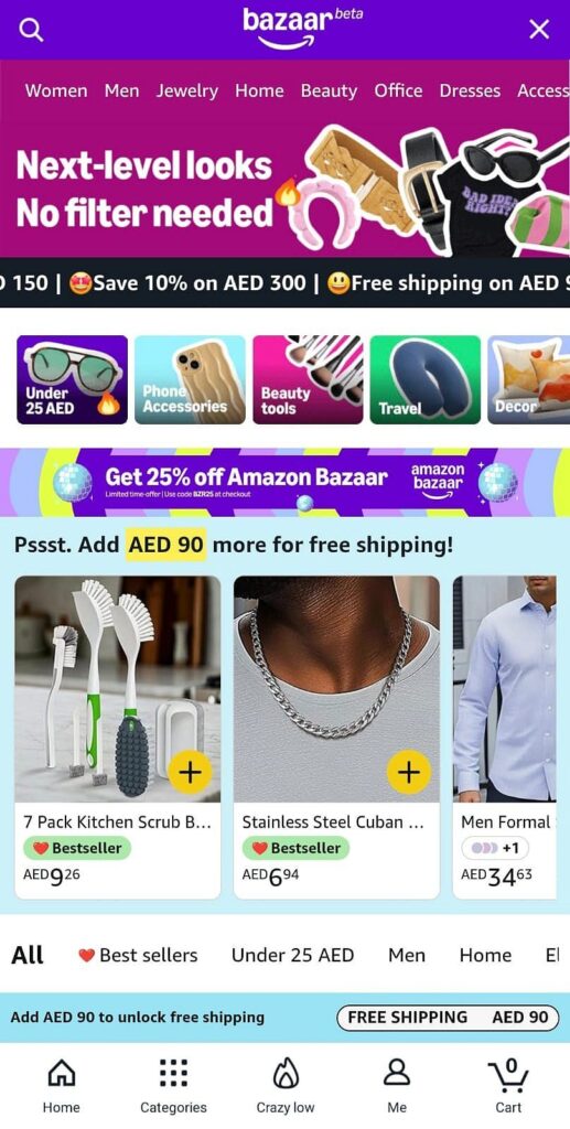 Amazon uygulamanızda parlak mor bir bölüm göründüğünü fark ettiniz mi? Çevrimiçi alışveriş platformu artık yalnızca BAE’de alışveriş yapanlar için ‘Amazon Bazaar’ adlı yeni bir bölüm başlattı.