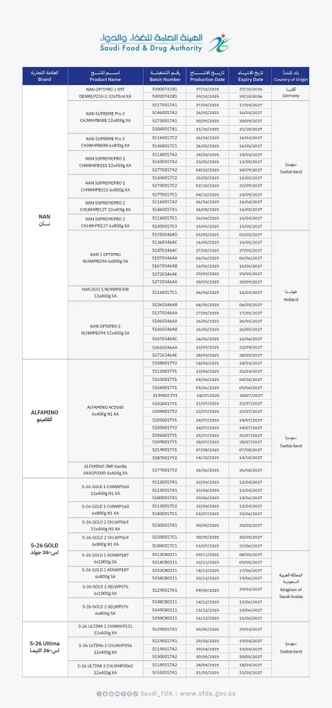 Suudi Gıda ve İlaç Kurumu (SFDA), Nestlé tarafından NAN, ALFAMİNO, S-26 GOLD ve S-26 ULTİMA markaları altında üretilen bebek maması ürünlerinin tüketilmesine karşı uyarıda bulundu.