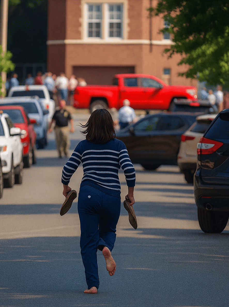 Silah sesine doğru koşan bir anne, uzakta değil. Kaosa doğru, güvenliğe değil. Ellerinden sarkan ayakkabılar çünkü hiçbir şey — korku değil, mantık değil, kendi güvenliği bile – çocuğuna ulaşmaktan daha önemli değildir.