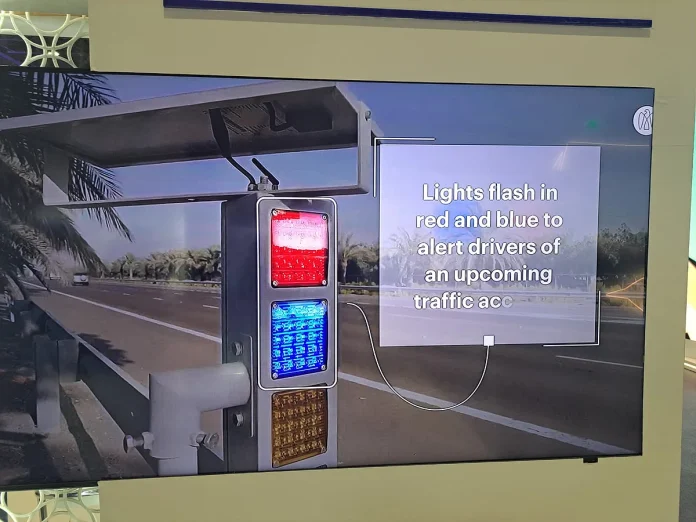 “Kırmızı ve mavi renkler, ileride bir kaza olduğu için dikkatli olmanız gerektiği anlamına geliyor. Pandemi sırasında koronavirüs uyarı mesajları gönderen polis gibi uyarı mesajları göndererek yol kullanıcılarını uyarmaya çalışıyoruz “dedi. İnsansız Sistemler Fuarı (UMEX) ve Abu Dabi Fuar Merkezi’nde gerçekleşen Simülasyon ve Eğitim Fuarı (SımTEX) temsilcisi.