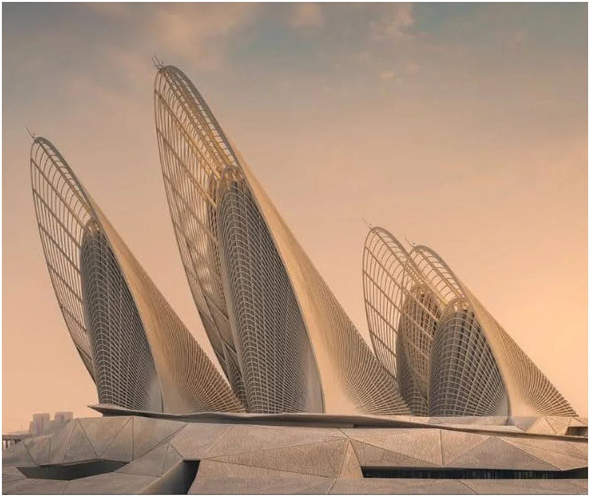 Müzenin üzerinde yükselen beş çelik yapı, Emirlik kültürünün ayrılmaz bir parçası olan bir uygulama olarak kabul edilen şahinle uçarken bir şahinin kanadından ilham alıyor.
