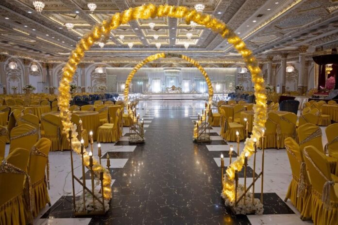 Kompleksin bazıları 7.000 kişiye kadar ağırlayabilen dört salonunu plastik çiçek demetleri, taht tarzı kanepeler, yaldızlı süslemeler ve neon ışıklar dolduruyor.
