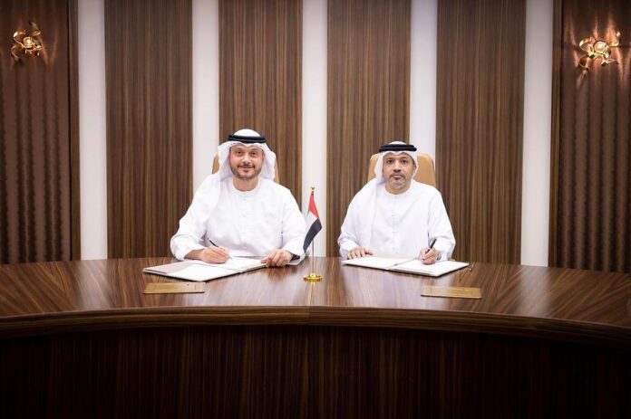 Anlaşma Müh tarafından imzalandı. Arazi ve Gayrimenkul Düzenleme Dairesi Genel Müdürü Omar bin Omair Al Muhairi ve Ajman Bank İcra Kurulu Başkanı Mustafa Al Khalfawi.