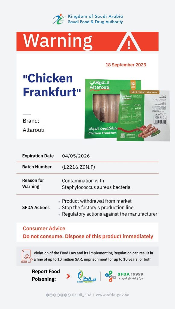 Suudi yetkililer, testler ürünün ciddi sağlık riskleri oluşturabilecek Staphylococcus aureus bakterileri ile kontamine olduğunu doğruladıktan sonra sakinlere Altarouti marka Frankfurt Tavuğu tüketmemelerini tavsiye etti.