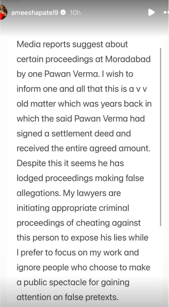 Tartışmayı ele alan Ameesha, konunun eski olduğunu ve yıllar önce çözüldüğünü iddia ederek İnstagram üzerinden ayrıntılı bir not paylaştı.Açıklamasında, etkinlik organizatörü Pawan Verma’nın bir uzlaşma tapusu imzaladığını ve kararlaştırılan 14,5 yüz bin Rupi tutarının tamamını aldığını açıkladı. Ayrıca, anlaşmaya rağmen, “yanlış iddialar” olarak tanımladığı şeyle yeni yargılamalar başlatıldığını iddia etti.”