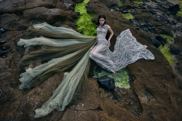 Koleksiyon, rüya gibi kumaşlar, akıcı çizgiler ve güneşin battığı Akdeniz kıyılarından ilham alan bir paletle zahmetsiz bir zarafeti bünyesinde barındırıyor. Palet, İbiza ve Mallorca’nın dalgalanan dalgalara yansıyan parlayan gün batımlarını, kırmızılar, yeşiller ve safir mavilerindeki canlı sualtı yaşamını ve yüzeyin altında sallanan veya altın kıyılarda kuruyan deniz otu – Posidonia dokularını yansıtıyor. Yumuşak nötrler, okyanus mavileri ve sessiz metalikler bölgenin huzurunu yakalarken, couture detayları derinlik ve incelik katıyor.
