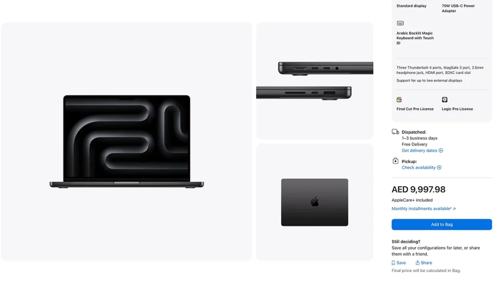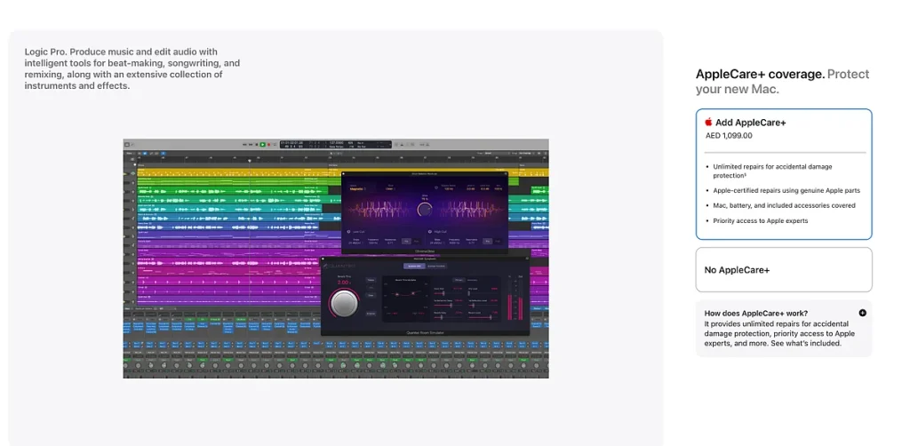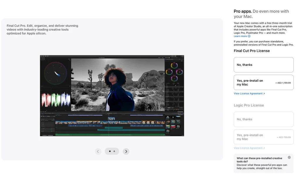 Apple da güç adaptörü ve klavye dil olarak elde Final Cut Pro ve Logic Pro lisans seçmenizi sağlar. Daha sonra satın alma işlemini tamamlamadan önce AppleCare+ kapsama ekleyebilirsiniz.