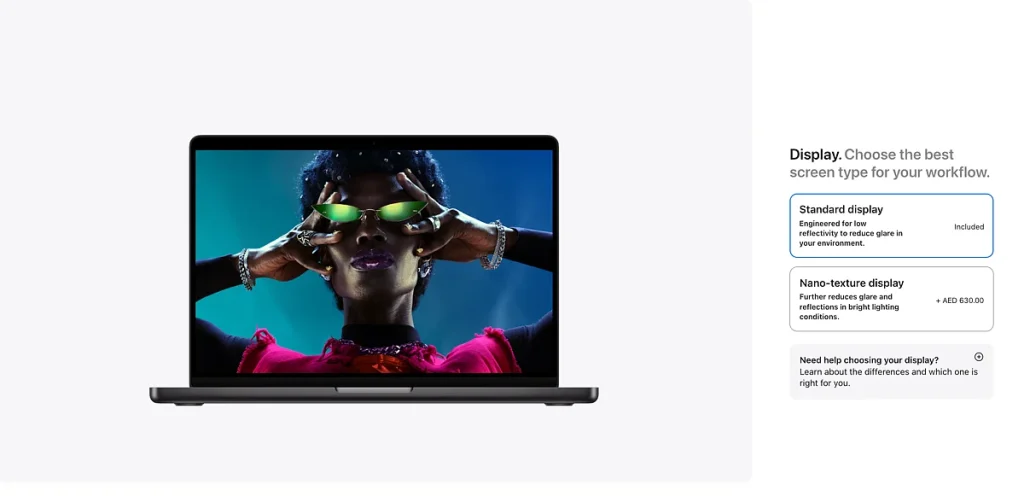 süreç şimdi 14-inç veya 16-inç ekran boyutu ve renk seçimi ile başlar. Oradan, bir alıcı nano için doku görüntü tercih, mevcut Apple M seçim-serisi cips ve çekirdek yapılandırmaları ve sonra RAM ve SSD depolama özelleştirebilirsiniz.