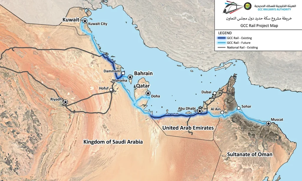 KİK Demiryolunun Aralık 2030’a kadar tamamlanması planlanıyor; Ağ, Körfez İşbirliği Konseyi’nin (KİK) altı üye ülkesini birbirine bağlayacak: Suudi Arabistan, BAE, Umman, Katar, Kuveyt ve Bahreyn.