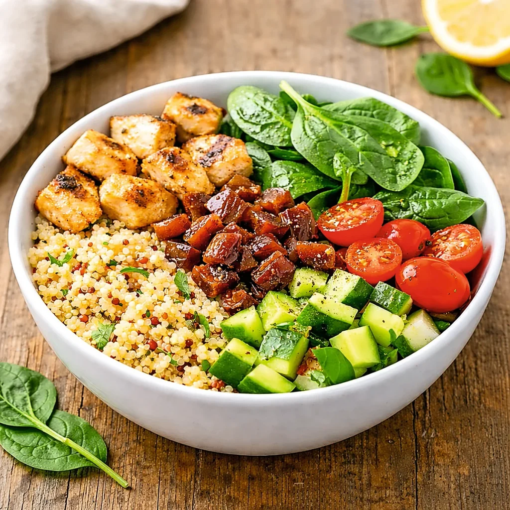 - Kinoa veya esmer pirinci baz olarak bir kaseye koyun.Yağsız protein için ızgara tavuk veya nohutu ekleyin.Lif ve doğal tatlılık için üzerine taze sebzeler ve doğranmış hurmalar koyun.Üzerine zeytinyağı ve limon suyu gezdirin.Hafifçe fırlatın ve dengeli, enerji verici bir iftar kasesinin tadını çıkarın.