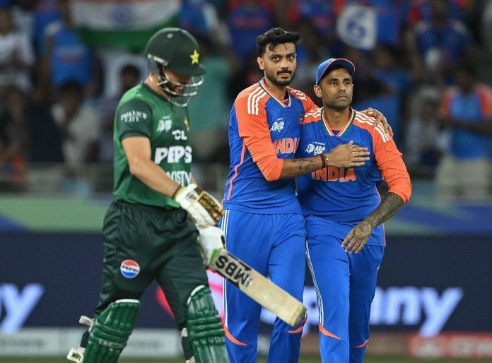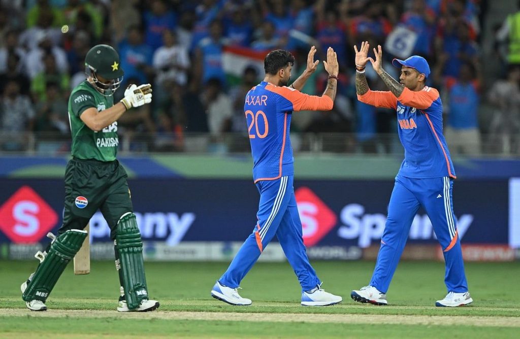 Pakistan’ın kaptanı kısa bir 12 top kaldıktan sonra düşüyor ve Axar Patel’den riskli bir çapraz vuruş yapmaya çalışıyor. Kenar, Abhishek Sharma’nın yakalamayı tamamladığı derin kare bacağa uçar.