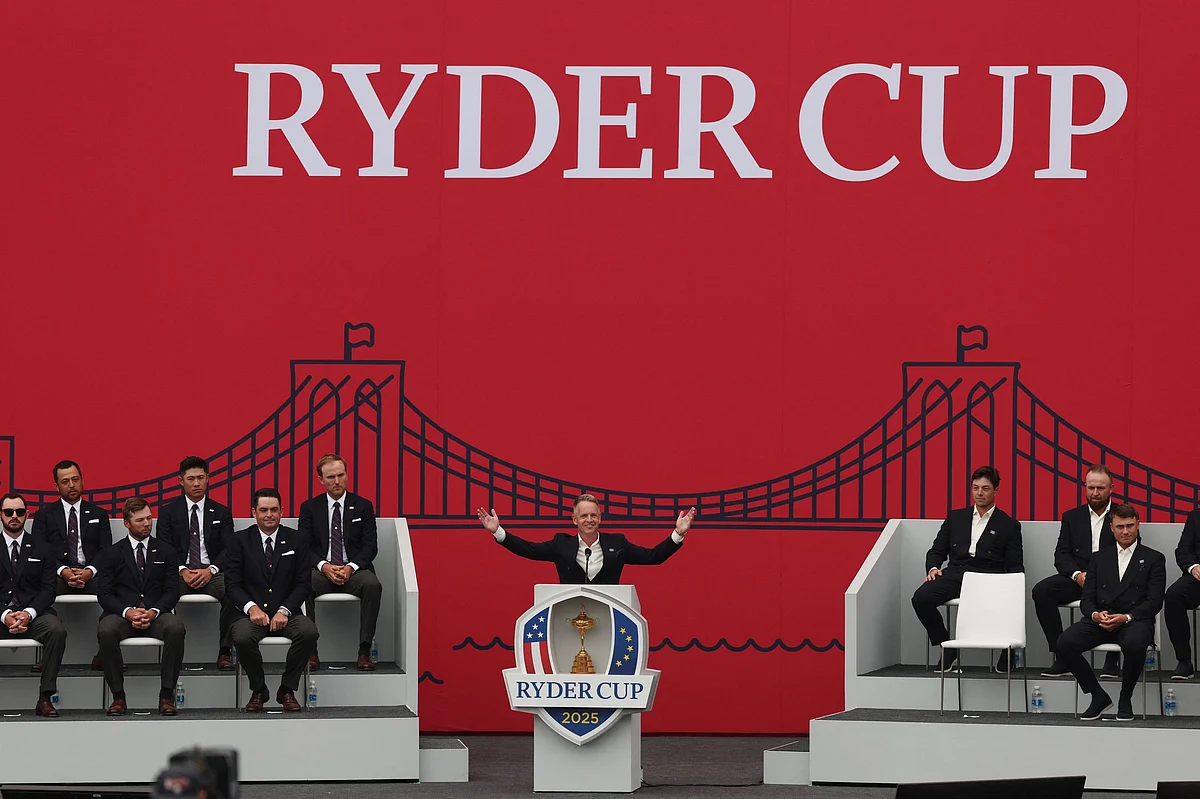 Ryder Kupası’nı beşinci denizaşırı zaferiyle korumak isteyen Avrupa, ilk tişörtün yanındaki sahnede ilk kez tanıtıldı ve açık yakalı beyaz gömleklerin üzerine koyu kruvaze blazerler giyerek geldi.