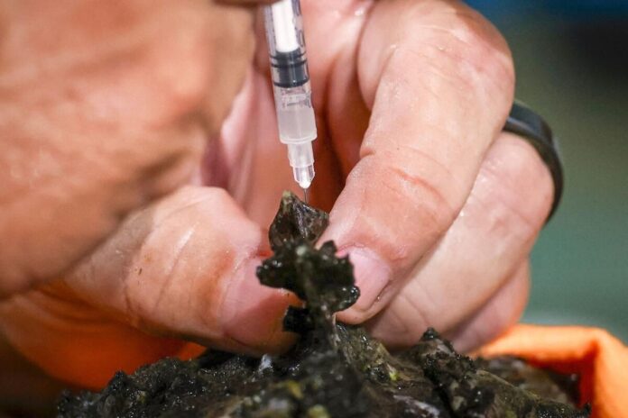 Araştırmacılar, canlı bir balığın zehir bezlerine, ölümcül sıvıyla dolu bir yüksüğü çekerken havluyla tutarak bir şırınga yerleştiriyorlar.