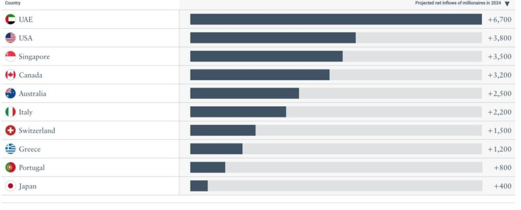 Milloinaire migration graphDünya çapında 14. sırada yer alan BAE, 116.500 milyoner, 308 santimilyoner ve 20 milyardere ev sahipliği yapıyor. Çalışma, 1 milyon dolar veya daha fazla likit yatırım yapılabilir servete sahip yüksek net değerli bireylere (HNWI’LER) sahiptir.“BAE’nin varlık yönetimi ekosisteminin evrimi ve gelişimi eşi görülmemiş. BAE, 5 yıldan kısa bir süre içinde zenginlere zenginliklerini korumak, korumak ve geliştirmek için bir dizi yenilikçi çözüm sunan sağlam bir düzenleyici çerçeve getirdi, ”diyor Dubai’deki Hourani’deki Özel Zengin ve Aile Ofislerine liderlik eden ortak Sunita Singh-Dalal.Dubai’nin emlak piyasasındaki güçlü kazanımlar, yerel emlak piyasasındaki en iyi yatırımcılar arasında ortaya çıkan çok sayıda ingiliz ve Avrupalı yatırımcıyı cezbetti. Ayrıca İNGİLTERE ve diğer Batı ülkelerindeki yüksek vergiler milyonerleri, aynı zamanda dünyanın en güvenli ülkesi olan BAE gibi vergi cennetlerine itiyor.“Dünyanın en büyük zenginlik cenneti olma yolunda emin adımlarla ilerleyen BAE, çekici bir altın vize teklifinden ve lüks yaşamdan stratejik bir konumda iş dostu bir ortama kadar milyonerleri çekmek için tüm durakları çekiyor. Sonuçlar kendileri için konuşuyor: BAE, 2024’te 6.700 milyonerden oluşan rekor net girişi memnuniyetle karşılamaya hazırlanıyor ve dinamik bir egemen servet mıknatısı statüsünü pekiştiriyor, ”diyor Henley and Partners’ın özel müşteriler grup başkanı Dominic Volek.Viyana’daki Beşeri Bilimler Enstitüsü Rektörü Misha Glenny, BAE’nin yüksek net değerli bireyleri kendi topraklarına çekme kabiliyetinde ilk kez herkesi geride bırakmadığını söyledi.“6.700’de BAE’nin 2024’te en yakın rakibi ABD’den neredeyse iki kat daha fazla yatırımcı çekmesi bekleniyor. 2022’de Ukrayna’nın tam ölçekli işgalinden bu yana zengin Rusların çıkışı çarpıcı bir şekilde düşmüş olsa da, ayrılanların çoğu BAE’YE gidiyor. Emirlikler, iki ekonominin uzun süredir yakın ilişkilere sahip olması nedeniyle, Hindistan’ın yüksek net değerli bireylerine de güçlü bir çekiciliğe sahip ”dedi.