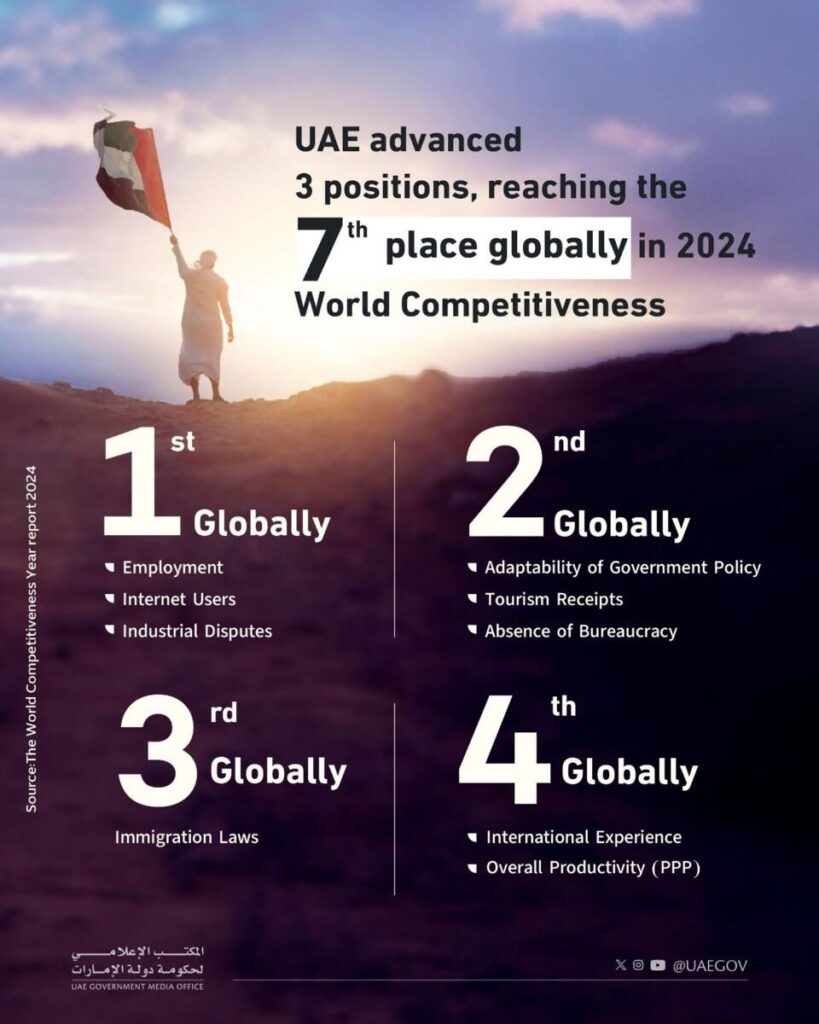 Hükümet medya ofisi Salı günü yaptığı açıklamada, BAE’nin üç sıra yükseldiğini ve şu anda 2024 Dünya Rekabet Edebilirlik Raporu’nda Norveç, İzlanda, Japonya, Kanada ve Finlandiya’nın önünde dünya çapında 7. sırada yer aldığını duyurdu.Dünya Rekabet Edebilirlik Raporu, ülkeleri hükümet verimliliği, eğitim ve inovasyon dahil olmak üzere ekonomik, idari ve sosyal alanlarda dört ana sütun ve 20 alt sütun temelinde sınıflandırır.Ülke geçen yıl İlk 10’a girdi ve istihdam, internet kullanıcıları ve endüstriyel anlaşmazlıkları çözmede dünya çapında ilk sırayı aldıktan sonra bu yıl son derece iyi bir performans sergiledi. Ülke ayrıca hükümet politikasının uyarlanabilirliği, turizm gelirleri ve bürokrasinin yokluğu açısından ikinci sırada yer aldı.