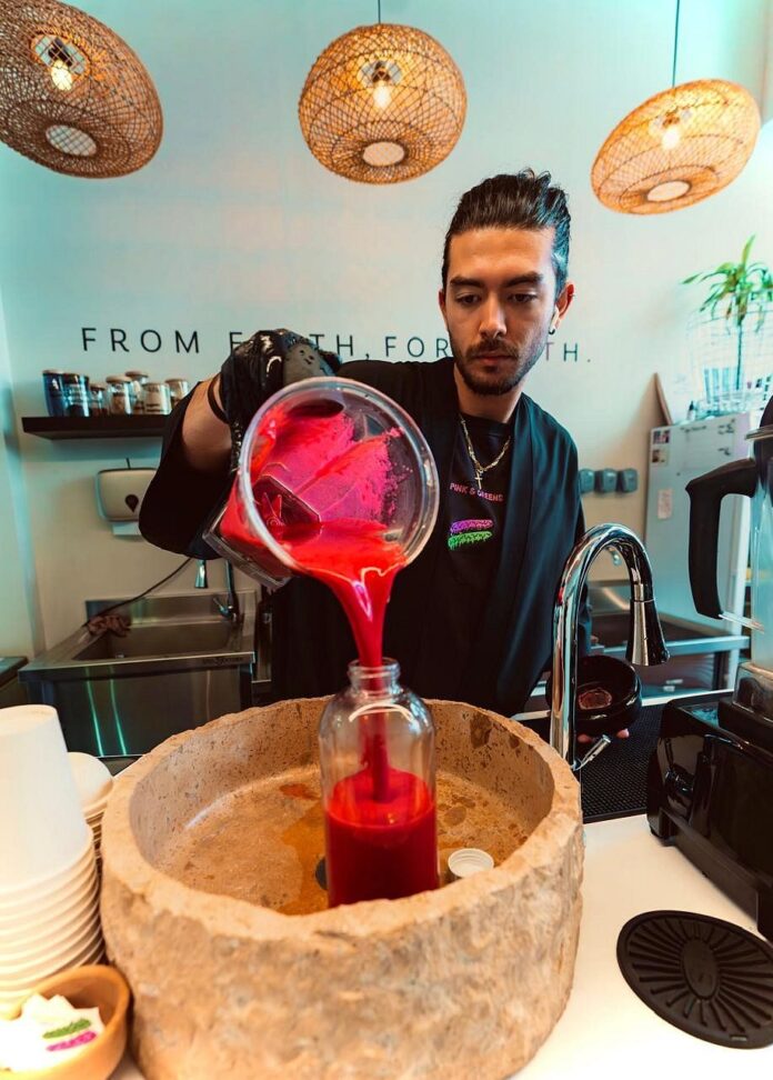 Yine de, çevreye duyarlı bir mağaza işletmek zorluklarla birlikte gelir. Örneğin kağıt bardaklar, görsel çekiciliğin önemli bir parçası olan içeceklerin renklerini veya katmanlarını göstermez. Ekip şimdi plastik gibi görünen ancak doğal olarak parçalanan biyolojik olarak parçalanabilen mısır nişastası kaplarına geçiyor.”İnsanların materyali yanlış anlamamasına dikkat etmeliyiz” dedi. “Plastik gibi görünüyor, ama bitkilerden yapılmış ve dünyaya geri dönüyor.”Diğer bir zorluk, meyve ve sebzelerin meyve suyundan elde edilen günlük posayı yönetmektir. Ben eskiden posayı kompostlayıp yerel çiftliklere teslim ederken, şimdi aktif olarak onu kullanmak için yeni yollar arıyor.“Boşa gitmesini istemiyorum” dedi. “Bu hamurda gerçek bir potansiyel var ve sürdürülebilir bir döngünün parçası kalmasını nasıl sağlayacağımıza bakıyoruz.”