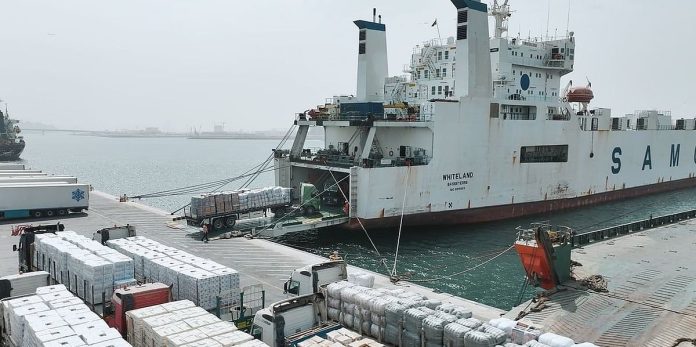 Gemi, Cumhurbaşkanı Ekselansları Şeyh Muhammed bin Zayed El Nahyan’ın direktifleri uyarınca 2.500 ton yiyecek, barınak ve tıbbi malzeme taşıyor.