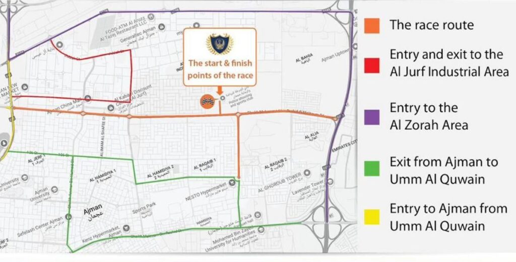 Perşembe günü Ajman Polis Genel Merkezi, 24 Kasım Pazar günü Ajman Bisiklet Yarışı için iki kilit caddedeki sürücüler için geçici yol kapanışlarını duyurdu.Bu kapanışlar sabah 6.15 ile 9.30 arasında gerçekleşecek.Kapatılacak yollar Şeyh Muhammed Bin Zayed Yolu ve Şeyh Fatıma Bint Mübarek Caddesi El Rakaib 2 ile El Jurf 1 arasındadır.Aşağıdaki haritaya bakın:
