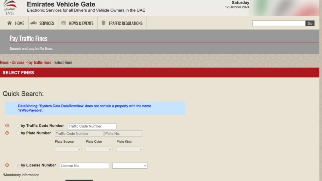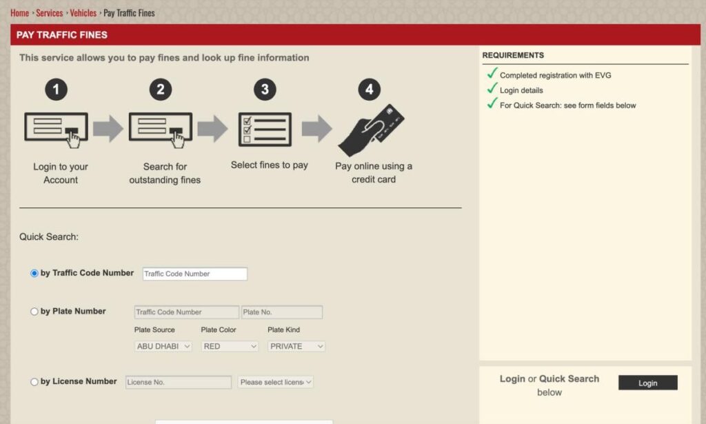 • Daha sonra, giriş yapmanız, web sitesine erişmek ve para cezalarınızı ödemek için BAE Geçiş Kartınızı kullanarak giriş yapmanız, ehliyet bilgileriniz gibi gerekli bilgilerinizi doldurmanız istenecek bir sayfaya yönlendirileceksiniz