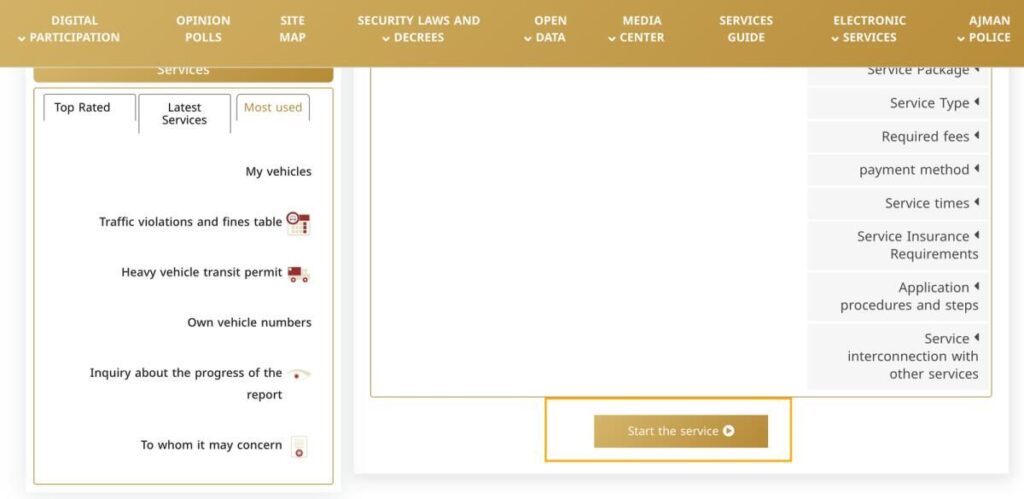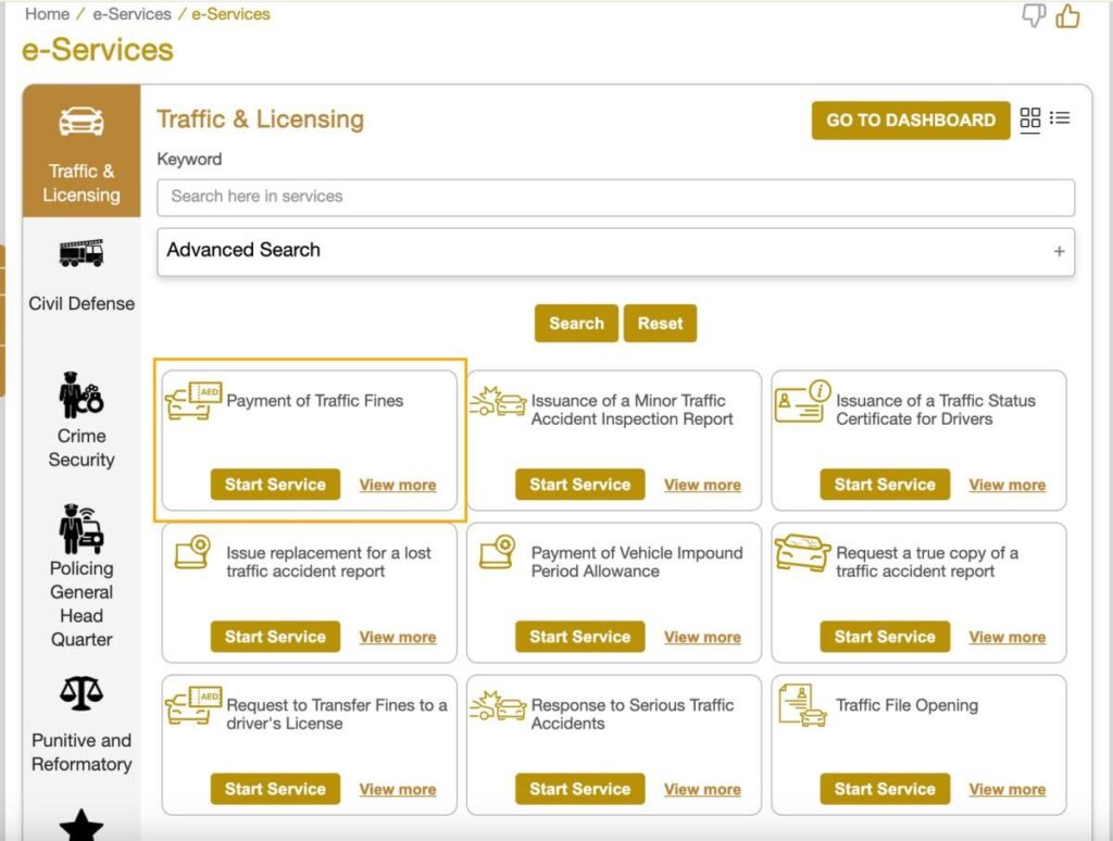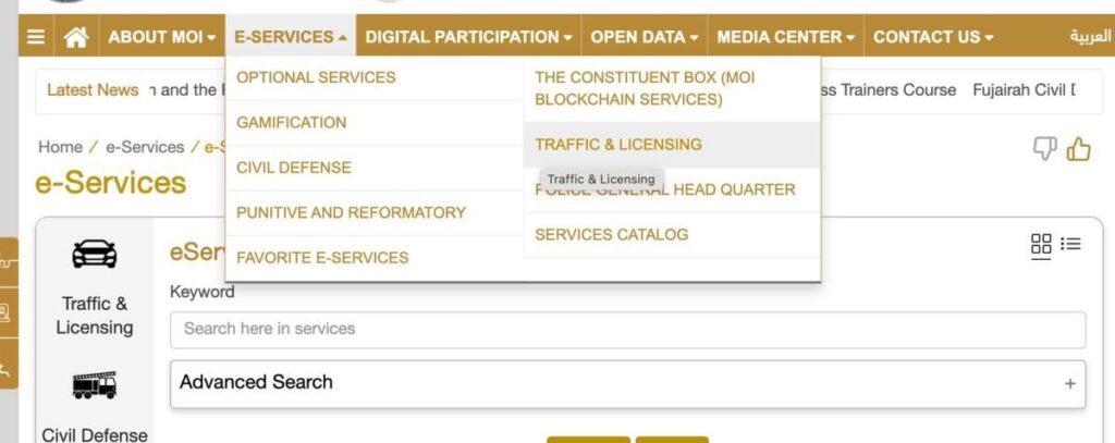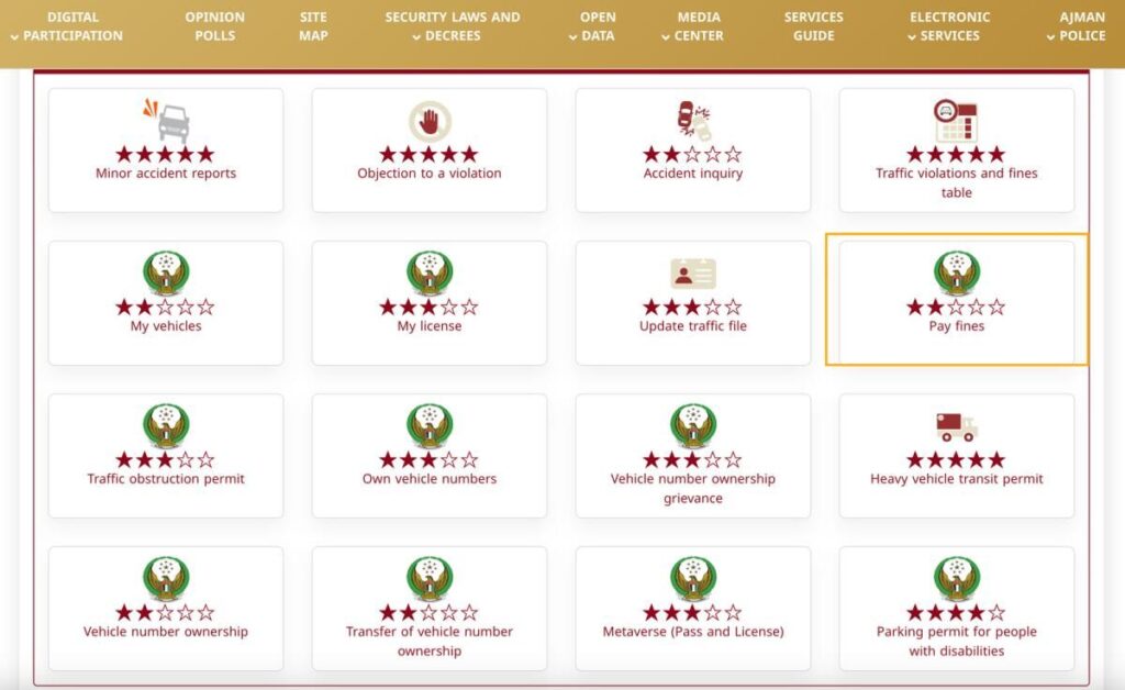 Trafik cezalarınızı İçişleri Bakanlığı (İçişleri Bakanlığı) web sitesini ziyaret ederek Ajman’da da ödeyebilirsiniz. Sadece şu basit adımları izleyin:İçişleri Bakanlığı web sitesine gidin (moi.gov.ae ), ‘E-Hizmetler’e dokunun, ‘Trafik ve Lisanslama’ya dokunun