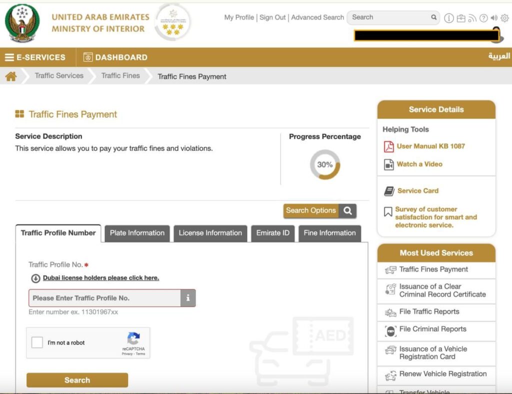 • ‘Hizmeti Başlat’a dokunun, BAE Geçiş Kartınızla oturum açın, ardından ‘Trafik Cezalarının Ödenmesi’ sayfasına yönlendirileceksiniz, Trafik profil numaranız, plaka numaranız, ehliyet numaranız ve Emirates kimliğiniz gibi gerekli bilgileri doldurun