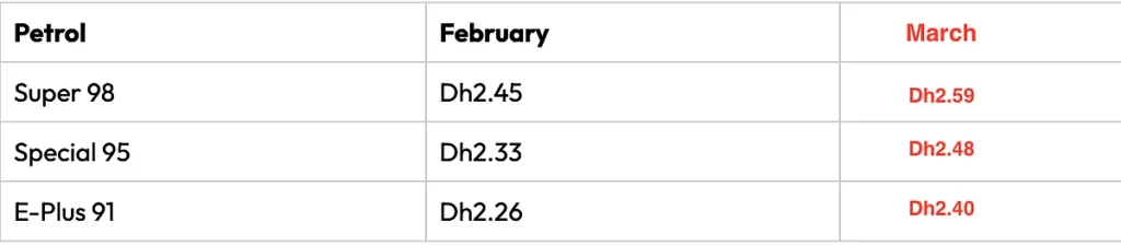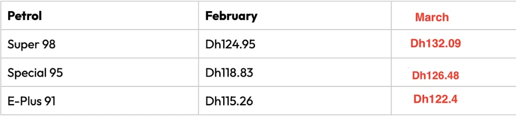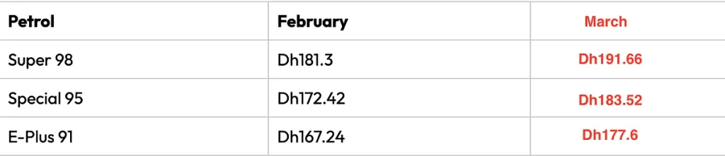 BAE’nin Enerji Bakanlığı onaylı akaryakıt fiyatları, dağıtım şirketlerinin işletme maliyetlerini ekledikten sonra, ister yukarı ister aşağı olsun, ortalama küresel petrol fiyatına göre aylık olarak belirlenir. Yeni fiyatlar 1 Mart’tan itibaren geçerli olacak ve aşağıdaki gibidir: