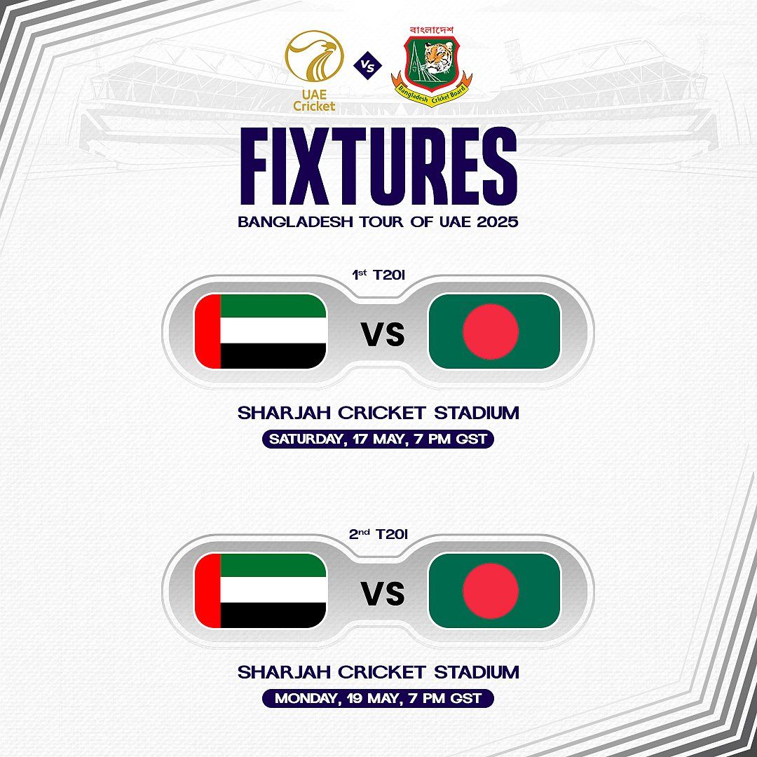 Bangladeş erkek kriket takımı, 17 ve 19 Mayıs tarihlerinde Sharjah Kriket Stadyumu’nda BAE’YE karşı iki T20 oynayacak.
