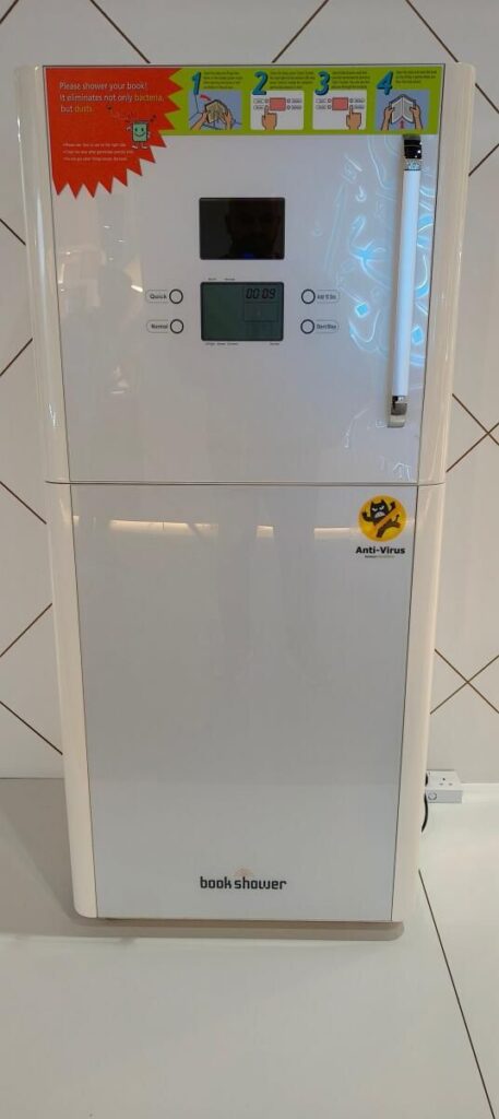 Buzdolabının üst kısmı bir vantilatör ve ultraviyole ışınları kullanacak şekilde özelleştirilmiştir. Bir kişi kapıyı açabilir ve içindeki tutucu kılavuzuna bir kitap yerleştirebilir.Kapıyı kapattıktan sonra 30 saniye süren hızlı bir mikrop öldürücü işlem için ‘hızlı’ düğmesine basılması veya 1 dakikalık tam bir mikrop öldürücü işlem için ‘normal’ düğmesine basılması gerekir.Mikrop öldürücü ve toz giderme işlemleri ‘başlat’ düğmesine basılarak yapılır. İşlem küçük bir pencereden görülebilir. Zamanlamalar bir ekranda görüntülenir.Süreç bittiğinde, kitap kaldırılabilir.Kitap fuarı 5 Mayıs’a kadar adnec’te devam edecek.