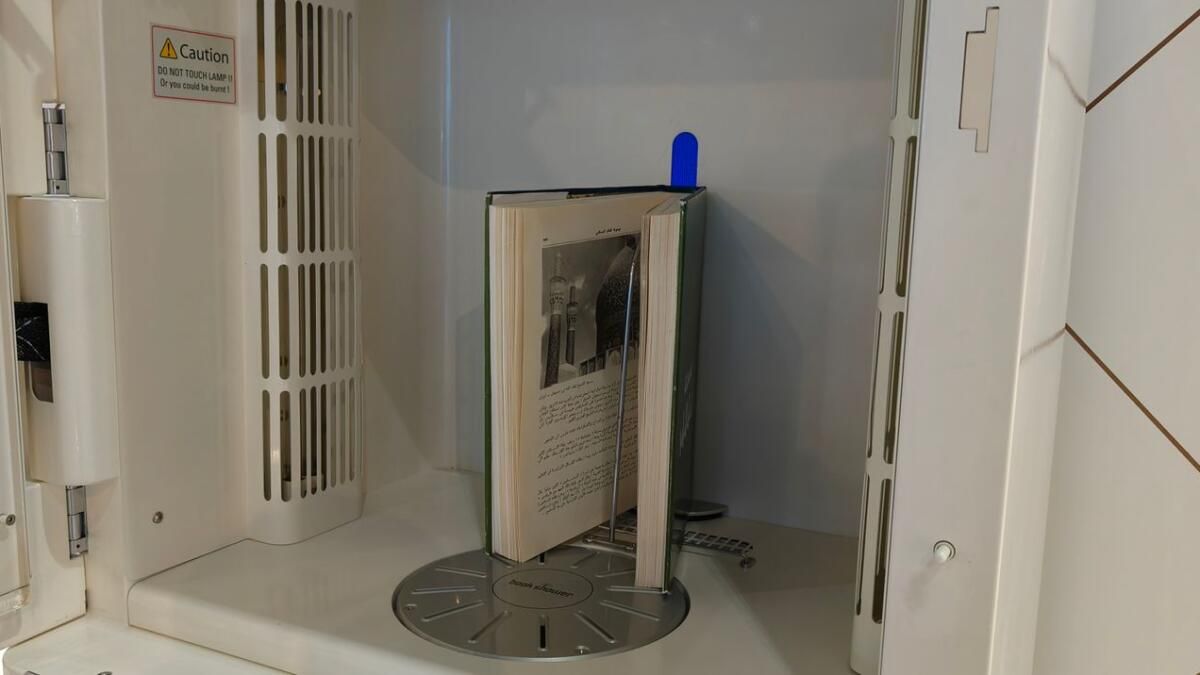 Ultraviyole ışınları ve vantilatör kullanan makine, caminin kütüphanesindeki binlerce kitabın ömrünü uzatmaya yardımcı oluyor.