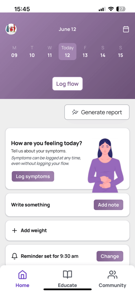 Track aracılığıyla kadınlar, adet akış düzenlerinin yanı sıra fiziksel, duygusal ve bilişsel olmak üzere 40’tan fazla semptom kaydedebilirler. Veriler paylaşılabilir bir PDF olarak derlenerek, dağınık deneyimleri sağlık hizmeti sağlayıcılarıyla daha bilinçli ve üretken konuşmalar sağlayan net, kapsamlı bir tabloya dönüştürür.