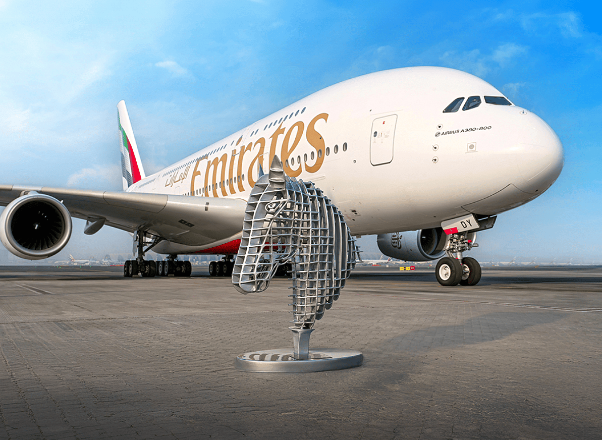 Kullanılmayan uçak parçalarından yapılmış bir at kafası mı? Dubai’nin bayrak gemisi Emirates, emekli uçağının geri dönüşüm malzemelerinden yapılmış sanat eserlerini tanıttı.