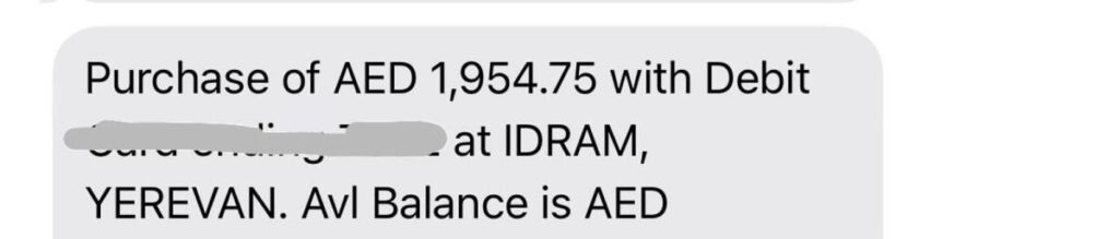 ”Dolandırıcılık konusunda çok bilinçliyim, bu yüzden birkaç kez kontrol ettim ve tekrar kontrol ettim” dedi ve Khaleej Times ile konuştu. “Ancak, web sitesinin yazımındaki küçük hatayı fark etmedim. Bu benim ilk hatamdı. Web sitesinin geri kalanı tam olarak Etisalat web sitesine benziyordu. Kart bilgilerimi girdim ve bir OTP aldım. Genellikle otp’yi aldığınızda, sadece numaraya bakarsınız ve mesajın tamamını okumazsınız. Yaptığım ikinci hataydı. Otp’ye girdiğimde, hesabımdan bir miktar Dh1954.75 düşüldü.” (Aşağıdaki fotoğrafa bakın)