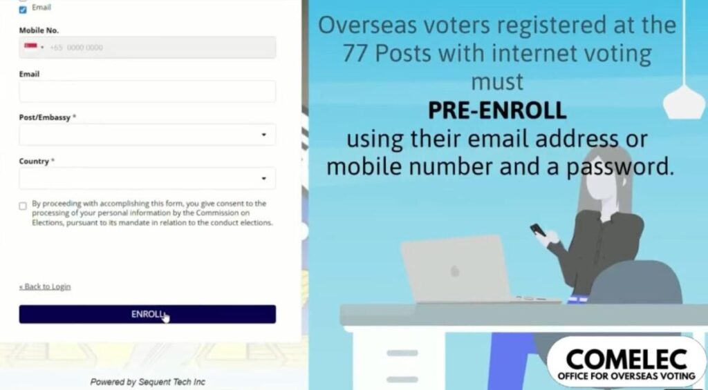 Comelec, internet oylamasına katılmak için kayıtlı Filipinli denizaşırı seçmenlerin şunları yapması gerektiğinin altını çizdi:Ön kayıt yaptırın veya kaydolun, Geçerli bir kimlik ibraz edin ve canlı fotoğraf çekimi yapın, Bilgilerin Denizaşırı Seçmenlerin Ulusal Siciline uygun olduğundan emin olun