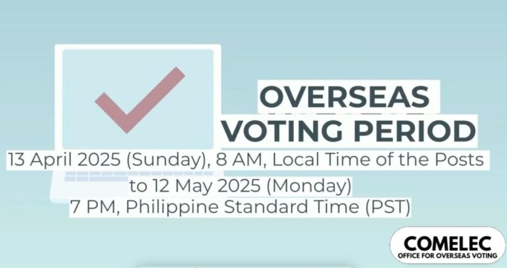 Filipinler’deki seçim günü 12 Mayıs 2025’tir, ancak denizaşırı Filipinliler için devamsız oylama 13 Nisan’dan (Pazar) sabah 8’de (BAE saati) 12 Mayıs’a (Pazartesi) akşam 3’e kadar 30 gün sürecek.Gerçek çevrimiçi oylama sırasında, oturum açma oylama portalı denizaşırı seçmenin kayıtlı e-posta adresine veya cep telefonu numarasına gönderilecektir. Karışıklığı önlemek için, gerçek oylama 13 Nisan’da başladığında test oylama sitesi artık kullanılamayacak.