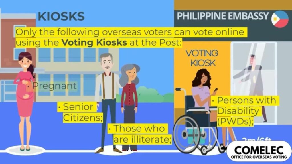 Comelec’e göre, yalnızca aşağıdaki denizaşırı seçmenler, yabancı misyonlardaki oylama kiosklarını kullanarak çevrimiçi oy kullanabilirler: yaşlılar, hamileler, okuma yazma bilmeyenler ve engelliler (özürlüler).