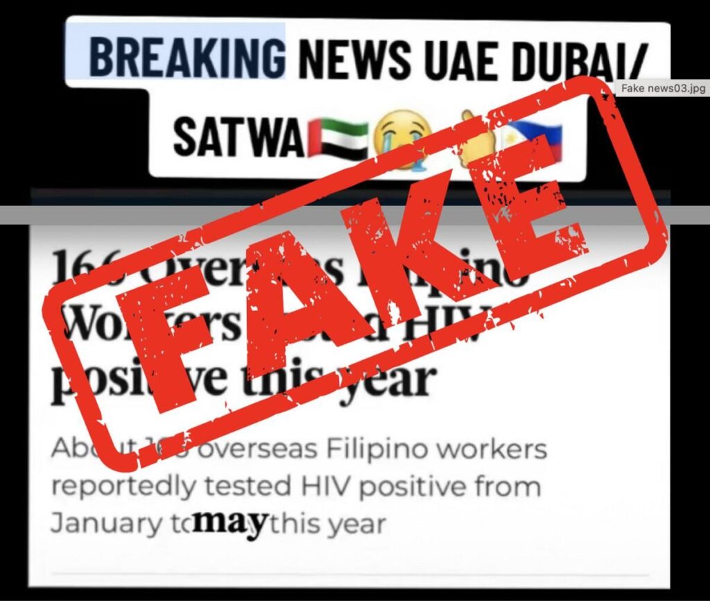 Filipinler’in BAE büyükelçisi ve toplum liderleri, 2024’ün ilk 6 ayında 160’tan fazla Filipinlinin HIV ile pozitif test edildiğini iddia eden sosyal medya yayınlarının ardından kababayan (vatandaşlarını) sahte haber yaymaktan kaçınmaya çağırdılar.“Sahte haberlerden kaçınmak için ihtiyat ve sorumluluk çağrımı yineliyorum. Filipin Büyükelçisi Alfonso Ferdinand A. Ver, BAE Hükümetinin sahte haberlerle mücadelede çok katı olduğunu vurgulayarak, resmi kaynaklardan onaylamadan önce herhangi bir haber veya bilgi yayınlamamalıyız ”dedi.BAE yasalarına göre, söylentilerin ve sahte haberlerin yayılmasının cezası 100.000 ila 200.000 Dh’nin yanı sıra bir ila iki yıl hapis arasında değişiyor.