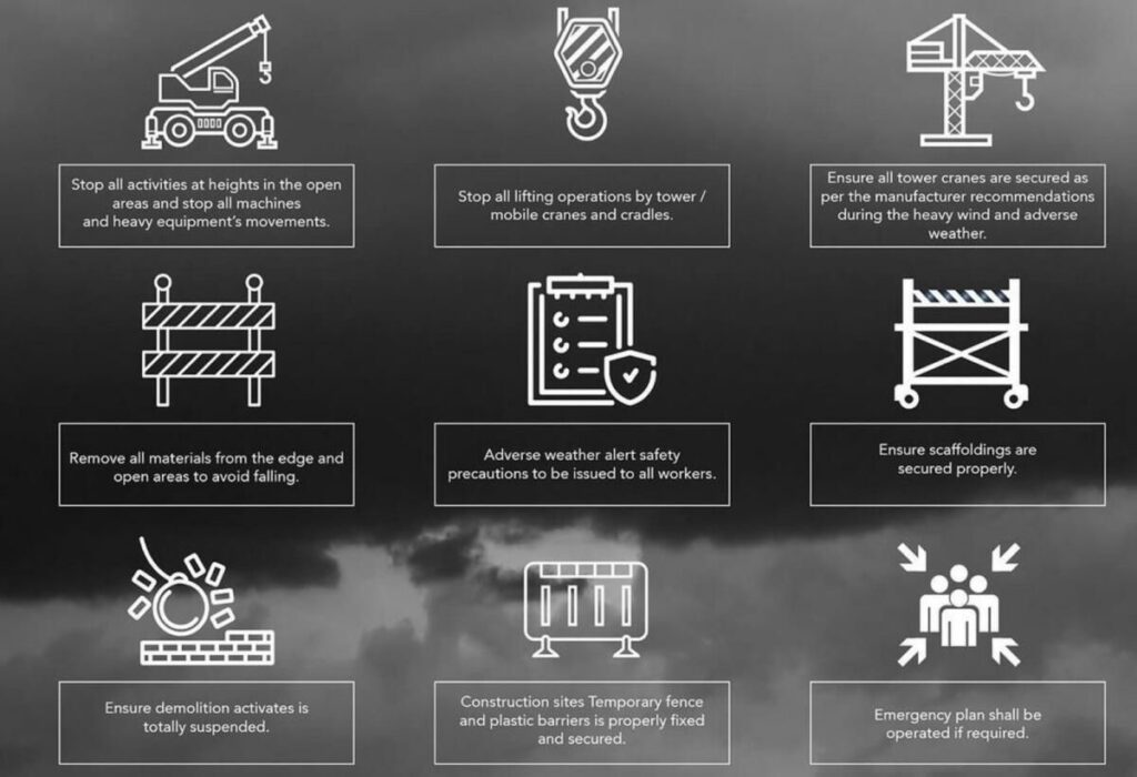 Abu Dhabi PoliceAbu Dabi Polisi, sürücüleri güvenli sürüşe uymaya, odaklanmaya ve pervasız sürüş ve sürüklenmeden kaçınmaya ve yağış sırasında trafik yasalarına uymaya çağırdı.Yeterli güvenli mesafeyi bırakın, Aniden frene basmayın, Aracın kaymasını önlemek için sırayla önemli ölçüde yavaşlayın, Kanyonlardan ve su depolarından uzak durun, Hız düşürme sistemi devreye girdiğinde öngörülen hız sınırına uyun, Denizcilere ve plaja gidenlere gitmeden önce hava durumunu kontrol etmeleri çağrısında bulunulur ayrıca, inşaat şirketleri aşağıda belirtildiği gibi güvenlik ve güvenlik standartlarına çok uygundur