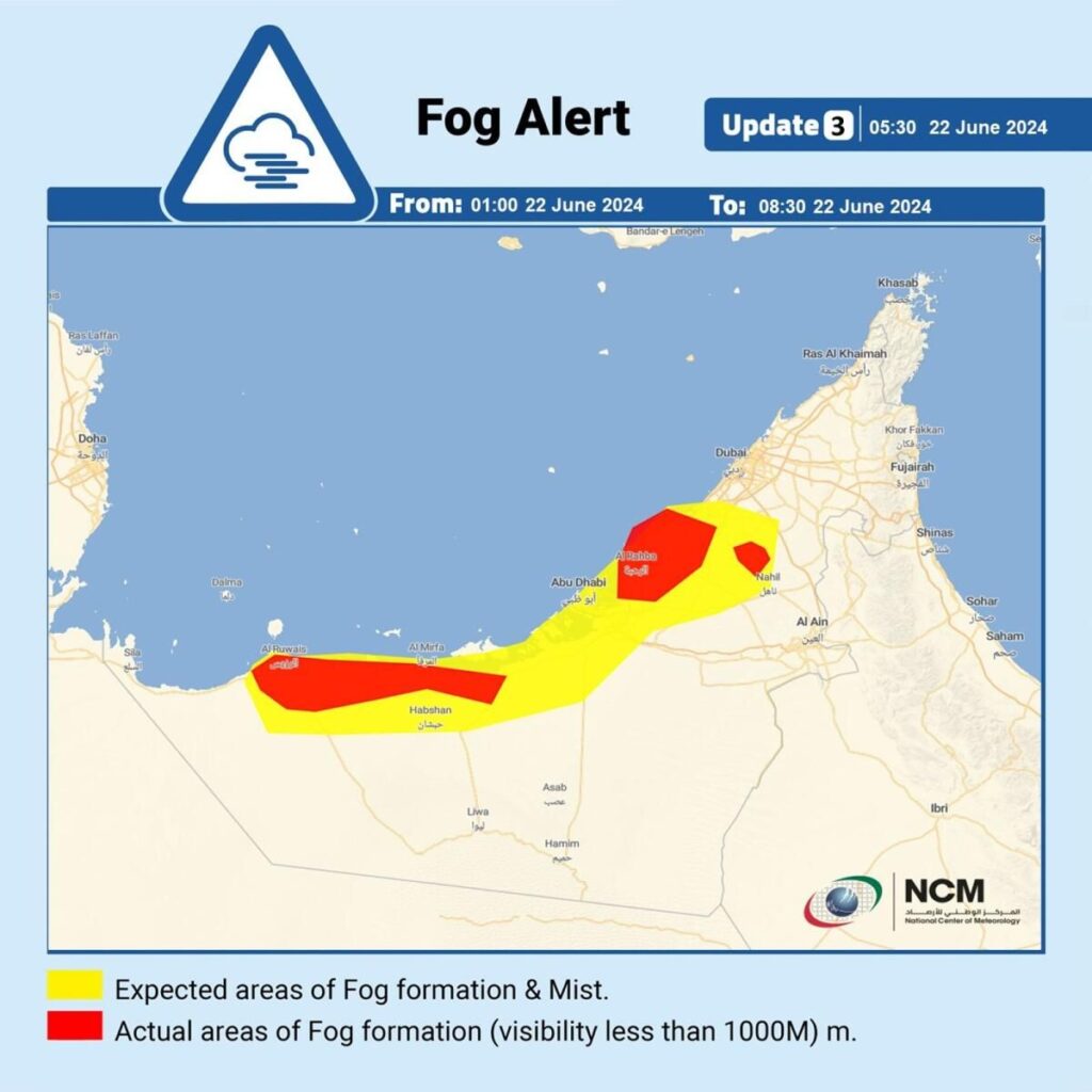 Ulusal Meteoroloji Merkezi (NCM), 22 Haziran Cumartesi sabahı sis oluşumunun neden olduğu zayıf görüş konusunda sürücülere bir uyarı yayınladı.Meteoroloji departmanı, sakinlere yatay görünürlükte bir bozulma olduğunu bildiren ve sabah saat 8.30’a kadar zaman zaman daha da düşebilecek bir kırmızı alarm gönderdi.Abu Dabi Polisi, X’teki bir gönderide, sis sırasında görüş mesafesinin azalması nedeniyle sürücüleri dikkatli olmaya çağırdı. Sürücülerden elektronik bilgi panolarında görüntülenen değişen hız sınırlarına uymaları istenir.