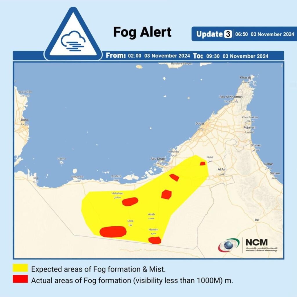 Ulusal Meteoroloji Merkezi (NCM), Pazar sabahı sis oluşumunun neden olduğu zayıf görüş konusunda sürücülere bir uyarı yayınladı.Meteoroloji dairesi, sakinlere yatay görünürlükte bir bozulma olduğunu bildiren ve sabah 9.30’a kadar bazı kıyı ve iç bölgelerde zaman zaman daha da düşebilecek bir kırmızı alarm gönderdi.Abu Dabi Polisi, X’teki bir gönderide, sis sırasında görüş mesafesinin azalması nedeniyle sürücüleri dikkatli olmaya çağırdı. Sürücülerden elektronik bilgi panolarında görüntülenen değişen hız sınırlarına uymaları istenir.