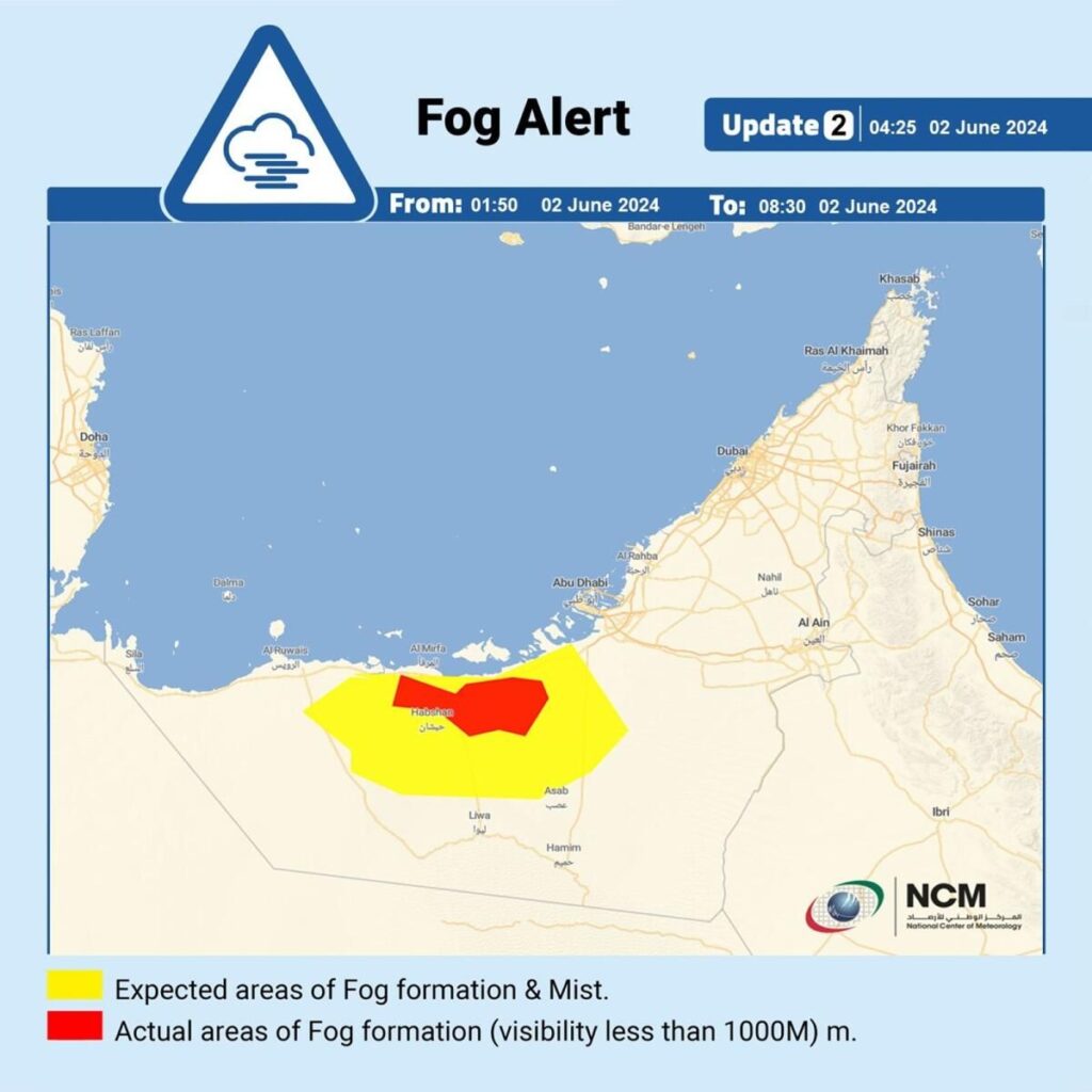 Ulusal Meteoroloji Merkezi (NCM), 2 Haziran Pazar sabahı sis oluşumunun neden olduğu zayıf görüş konusunda sürücülere bir uyarı yayınladı.Meteoroloji departmanı, sakinlere yatay görünürlükte bir bozulma olduğunu bildiren ve sabah saat 8.30’a kadar zaman zaman daha da düşebilecek bir kırmızı alarm gönderdi.