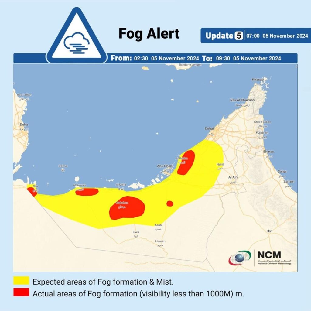 Ulusal Meteoroloji Merkezi (NCM) Salı günü BAE’deki sisli koşullar devam ederken kırmızı alarm verdi. Kırmızı alarm, koşullar ağırlaşabileceğinden sakinlerin son derece uyanık olmaları gerektiği anlamına gelir.Meteoroloji dairesi, sakinlere, sabah 9.30’a kadar bazı kıyı ve iç bölgelerde zaman zaman daha da düşebilecek yatay görünürlükte bir bozulma olduğunu bildirdi.Hava kışa girerken, BAE son birkaç gündür sabahları sisli koşullar yaşıyor ve yetkililerin sürücülerin güvenliği için hız sınırlarını azaltmasına neden oluyor.