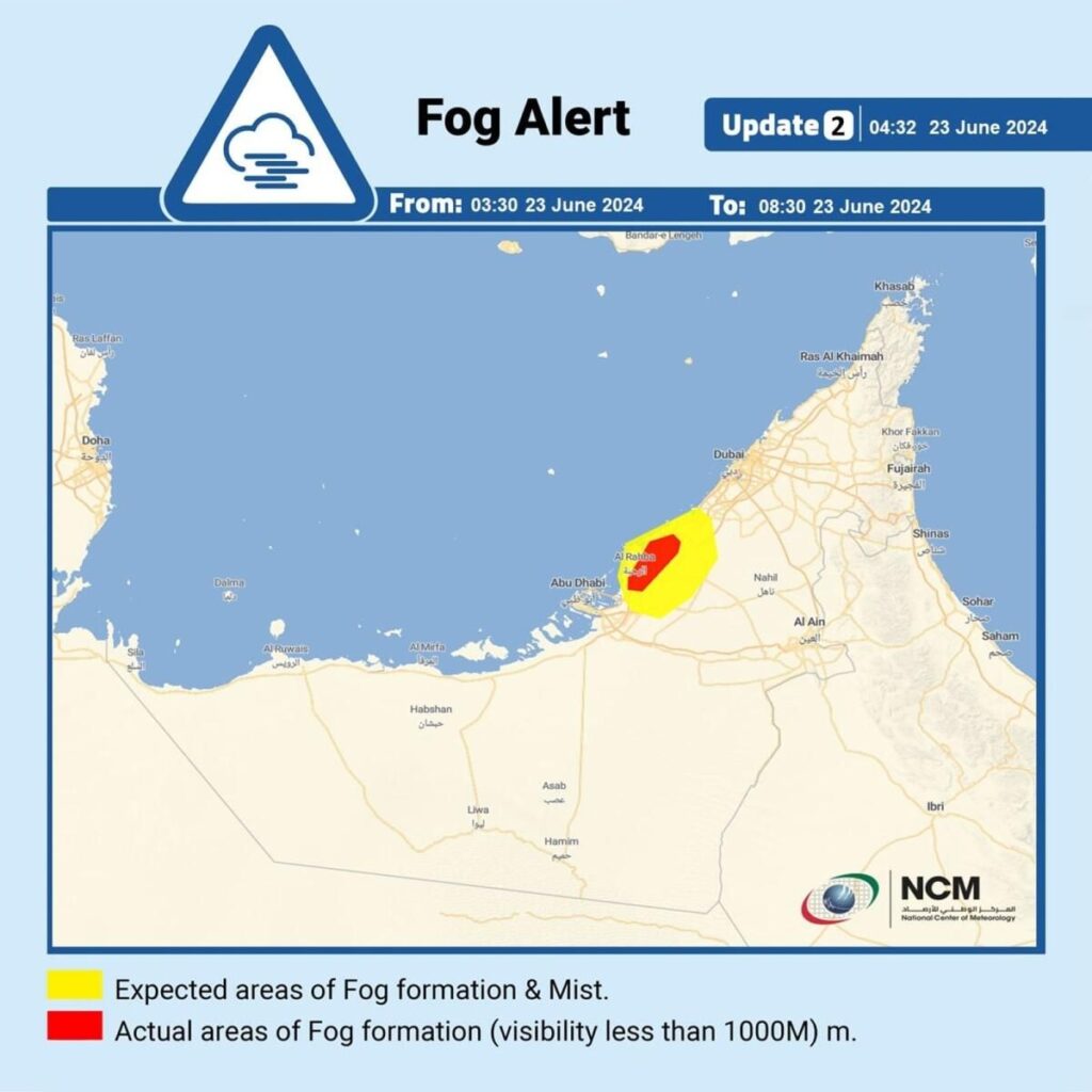 Ulusal Meteoroloji Merkezi (NCM), 23 Haziran Pazar sabahı sis oluşumunun neden olduğu zayıf görüş konusunda sürücülere bir uyarı yayınladı.Meteoroloji departmanı, sakinlere yatay görünürlükte bir bozulma olduğunu bildiren ve sabah saat 8.30’a kadar zaman zaman daha da düşebilecek bir kırmızı alarm gönderdi.Bir sosyal medya yayınında Abu Dabi Polisi, sürücüleri görünürlüğün zayıf olmasına karşı uyararak, hızları düşürmeye ve güvenlik trafik kurallarına uymaya çağırdı.