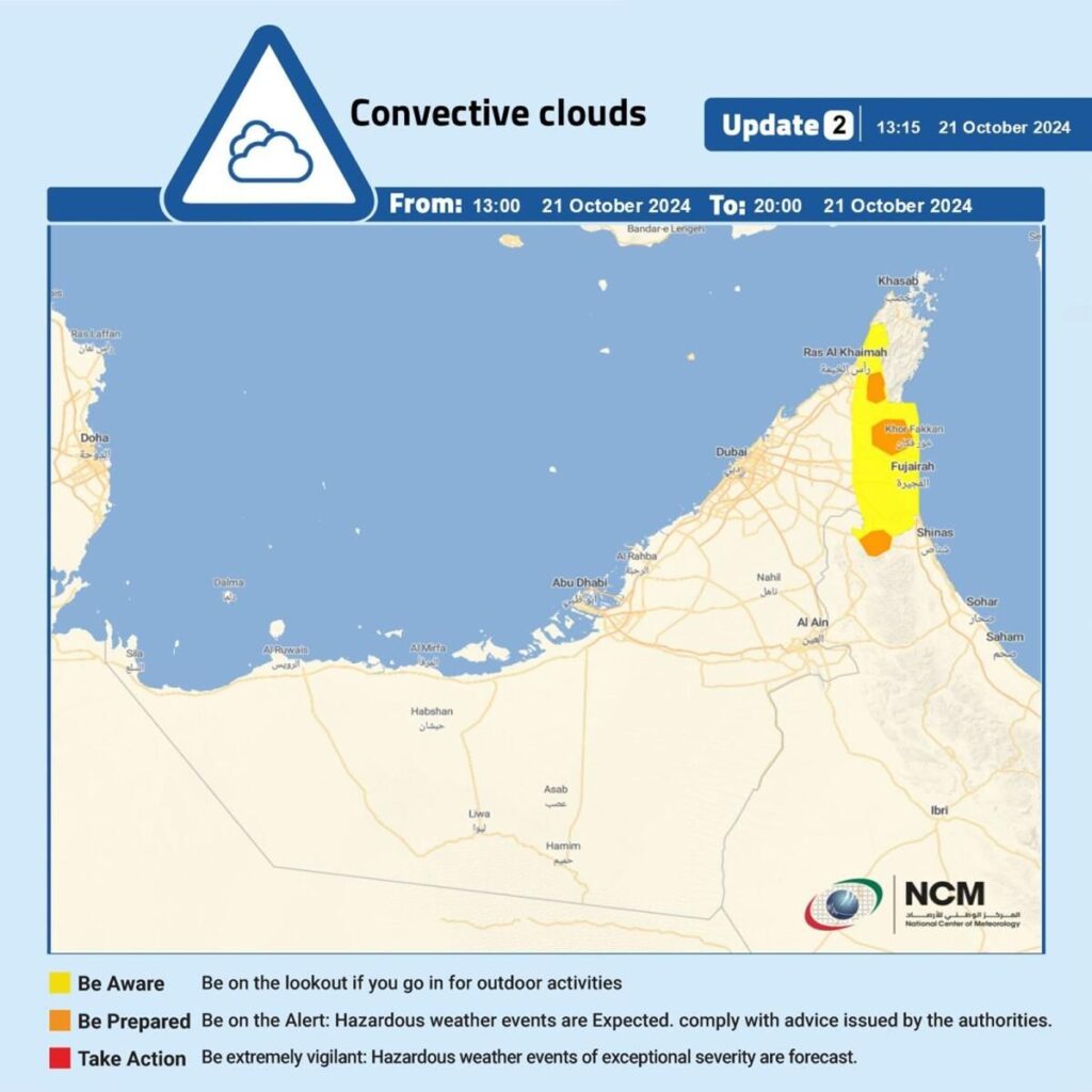Pazartesi öğleden sonra BAE’nin bazı doğu bölgelerini vuran yağmurlar, Sharjah’taki Khor Fakkan dağlarındaki şelaleleri tetikledi. Şarika’daki Wadi El-Helou Yolu bölgelerinde de bazı yağmurlar görüldü.Günün erken saatlerinde hava durumu departmanı, adil ila parçalı bulutlu gökyüzünün ülkeyi sarması beklendiğini tahmin etmişti. Bulutlar bazı doğu ve kuzey kısımlarında görünecek ve güneydeki bazı bölgelere yayılacak ve zaman zaman konvektif olabilir.Ulusal Meteoroloji Merkezi (NCM), bugün saat 8’e kadar yağışla ilişkili konvektif bulut oluşumu için sarı ve turuncu bir uyarı yayınladı.