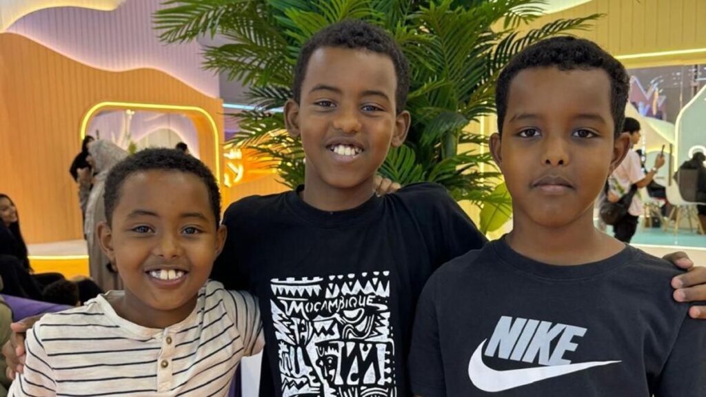 Nabil (ortada), Yunis (L) Nuh ile birlikte. Fotoğraf: Nasreen AbdullaSadece iki ay önce Birleşik Arap Emirlikleri’ne taşınan Somalili aile, sıbf’ye ilk kez katılmıştı. “Bu çok ilginç,” dedi Yunis. “Yakınlarda yaşıyoruz ve annem belki birkaç kez daha gelebileceğimizi söyledi çünkü denemek istediğim çok fazla atölye var.