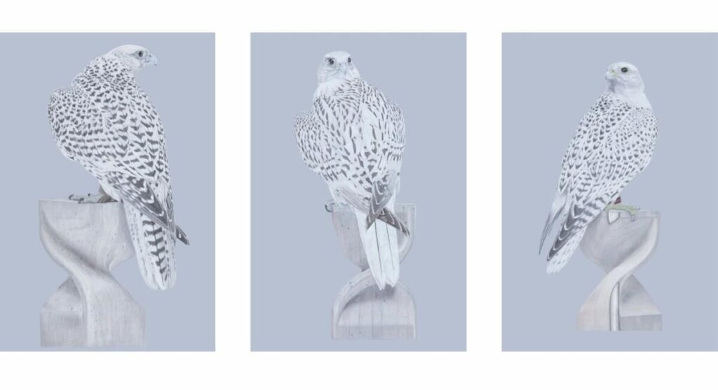 BAE’de güç ve geleneğin sembolü olan şahin, eserinde yinelenen bir motiftir. Örneğin Salama, Ishra adlı dizisinde, Emirlikler ile bu görkemli kuşlar arasındaki kalıcı ortaklığa saygı göstererek, kişisel deneyimlerini ve nesilden nesile aktarılan bir gelenek olan şahinliğin atalarının anısını yansıtıyor.Salama’nın en önemli işbirliklerinden biri, Emirlik araştırmacısı ve şahin yetiştiricisi Muhammed Al Kamda’nın bir kitabı için şahin portrelerinin ve av sahnelerinin görevlendirilmiş illüstrasyonları üzerinde çalıştığı Al Kamda Şahinleri ile.