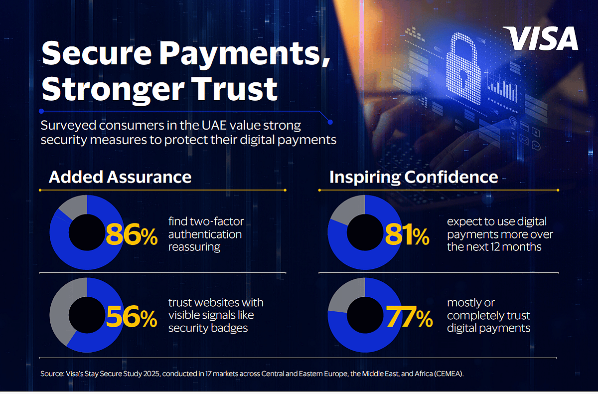Dijital ödemeler hız kazandıkça perakendeciler, bankalar ve ödeme işlemcileri, kullanıcıların satın alımları yazılı kodlar veya bağlantılar aracılığıyla onaylamalarını ve güvenilir güvenlik rozetleri göstermelerini talep ederek güven oluşturabilir. Birleşik Arap Emirlikleri’ndeki tüketicilerin yüzde seksen altısı, kimliklerini bir metin koduyla onaylamaları gerektiğinde kendilerini daha güvende hissederken, yarısından fazlası (yüzde 56) görünür güvenlik simgelerini takdir ediyor.