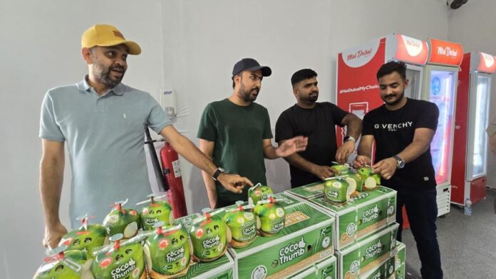 Berrymount Dubai’deki işçiler Zübeyr ve Faysal, ”Bugün hindistan cevizi suyu veriyoruz” dedi. “Ücretsiz su ve meyve sağlayarak insanların sıcakta nemlenmesini sağlamak için buradayız.”