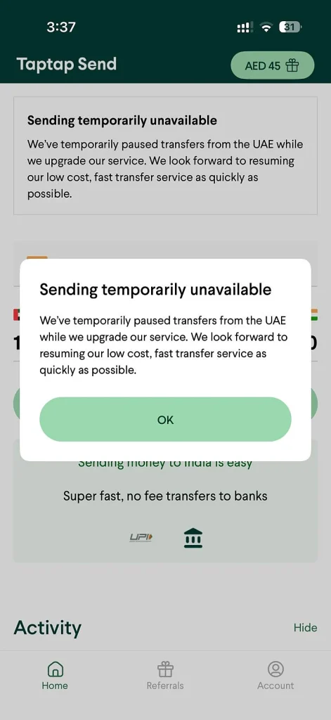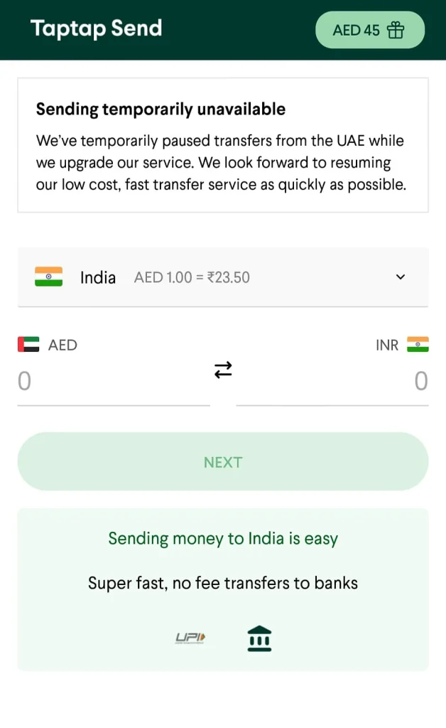 Kullanıcılar uygulamayı açtığında, “Gönderme geçici olarak kullanılamıyor. Hizmetimizi geliştirirken BAE’DEN transferleri geçici olarak duraklattık. Düşük maliyetli, hızlı transfer hizmetimize mümkün olan en kısa sürede devam etmeyi dört gözle bekliyoruz.”